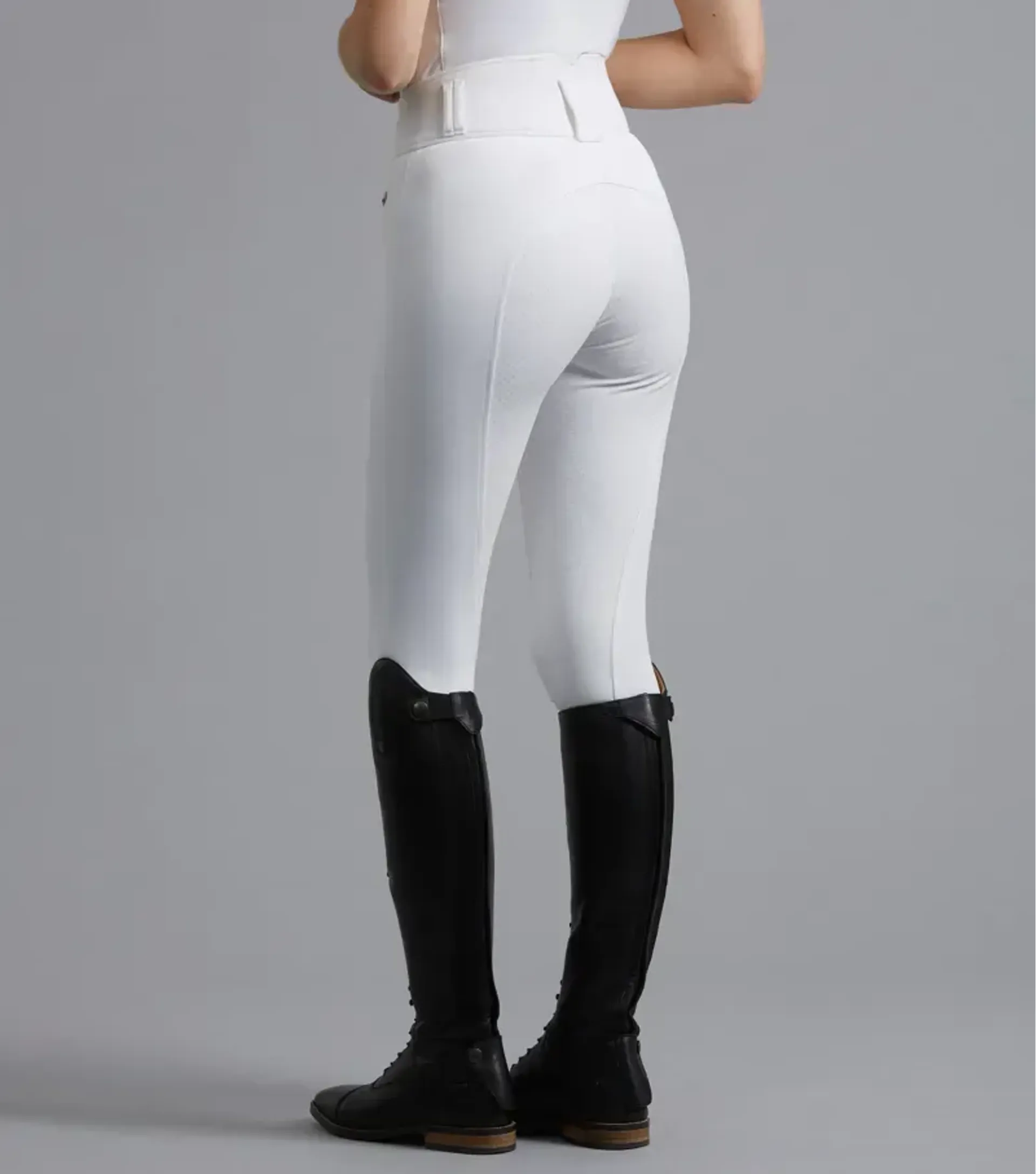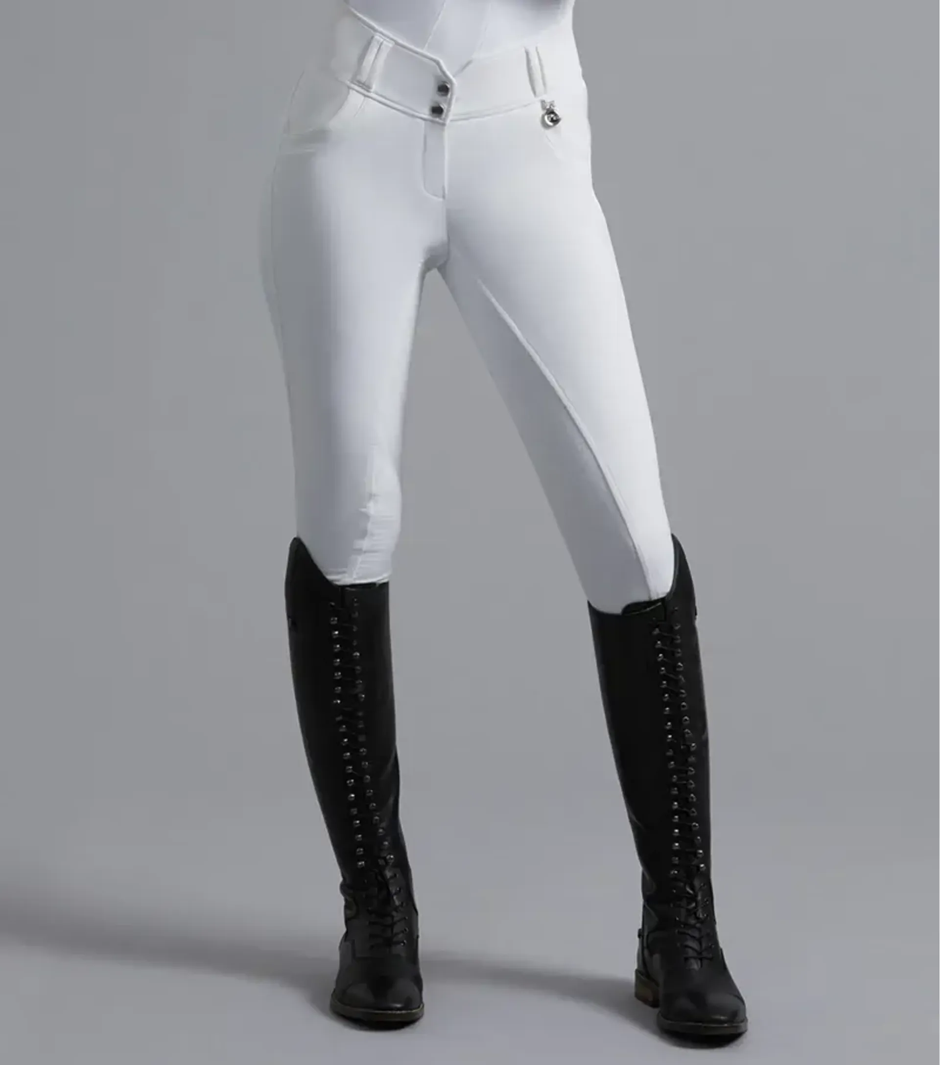 Engineered with a traditional four-way stretch fabric these ladies competition breeches are designed to perform, featuring an elegantly shaped high waist band which provides support to the riders core and aids in correct positioning, finished with double slider fastening for a flattening silhouette.